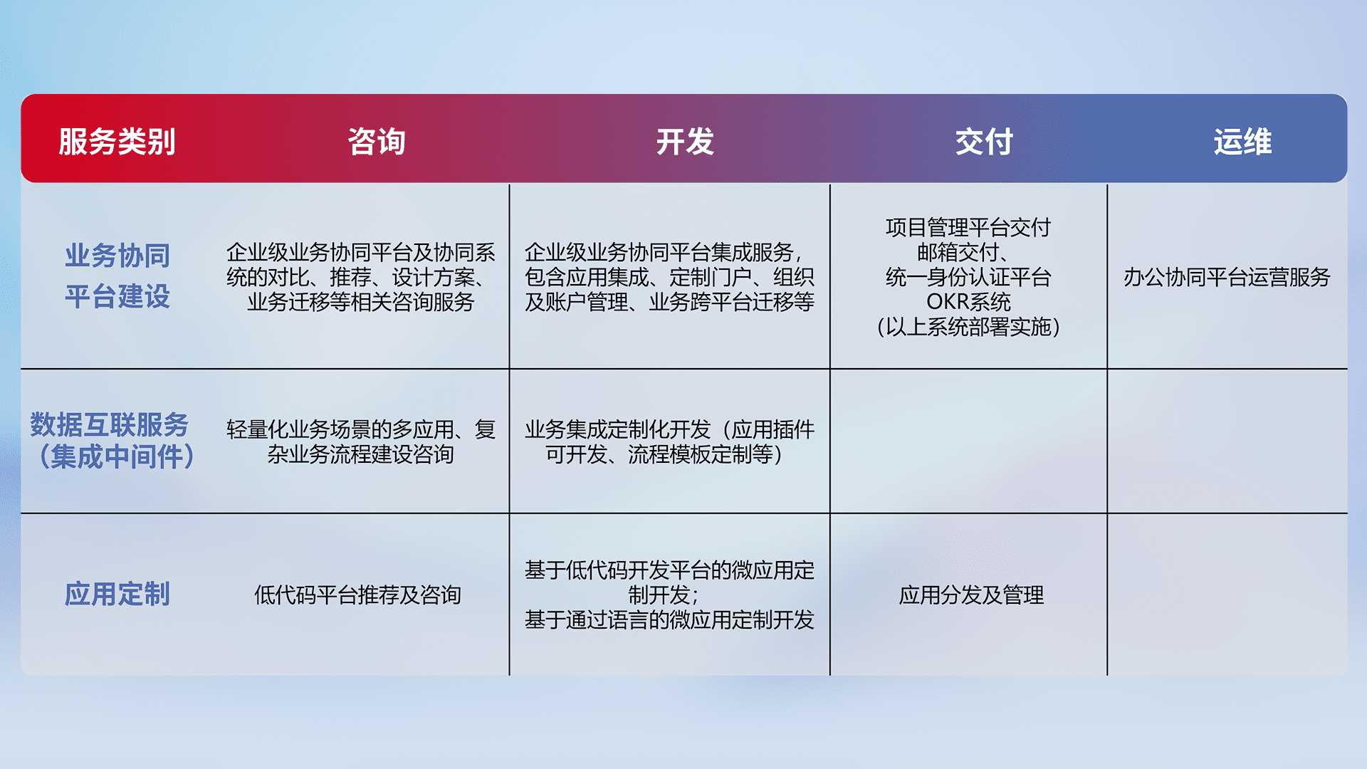 针对钉钉、、企微、、、、IDaas等平台级产品提供产品的规划、、、、方案、、、交付、、定制化开发等服务,,,,实现如统一协同办公、、、、智能客户服务、、、、混合会议管理、、、、智能数据查询、、等业务场景,,,,实现数字化转型。。。