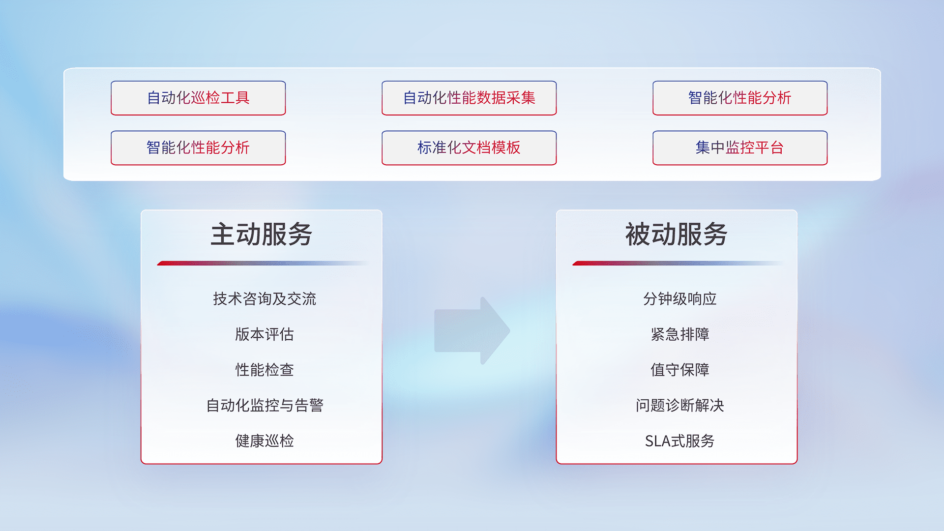 智能化工具和标准化文档,,,保障服务质量,,,提供主动服务(包含技术咨询、、、版本评估、、性能检查、、、自动化监控与告警、、、、健康巡检)和被动服务包含(分钟级响应、、紧急排障、、、、值守保障、、、、问题诊断解决、、SLA服务)。。